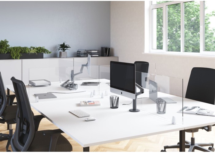 • Schreibtischteiler aus kristallklarem Plexiglas. Schützt vor Speichelprojektion und verhindert die Verbreitung von Viren (Höhe 61 cm)
