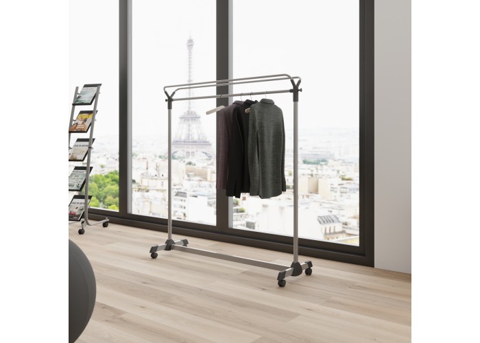 Diese mobile Garderobe mit großem Fassungsvermögen besteht aus einem oberen Fachboden, 2 Kunststoffhaken und 4 Rädern.