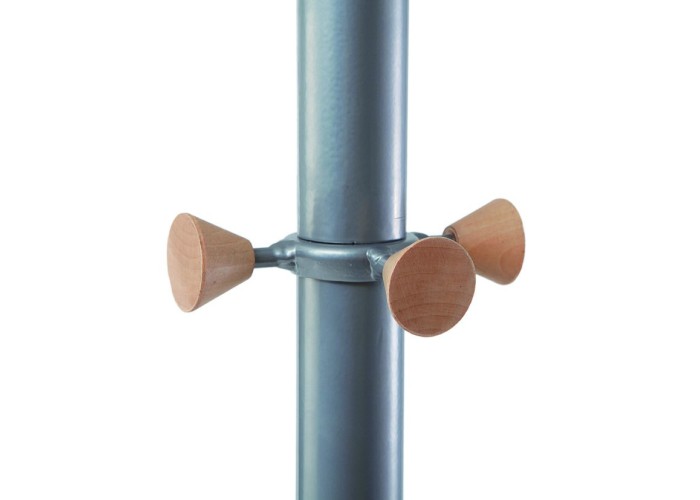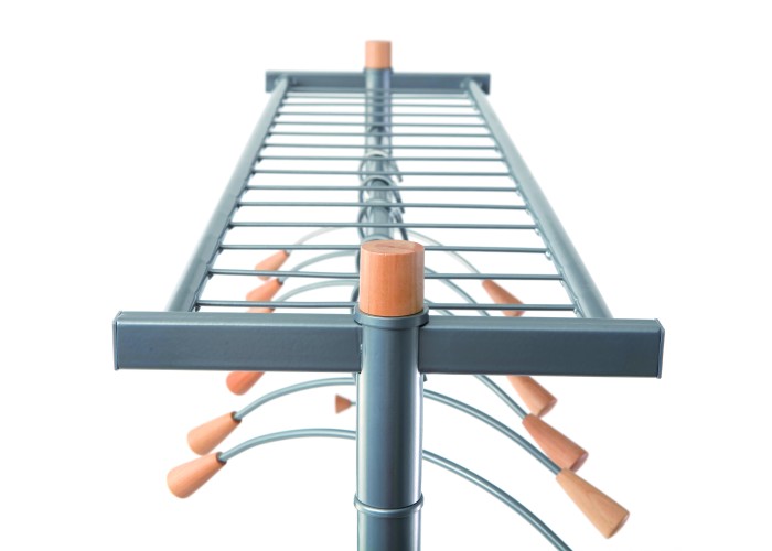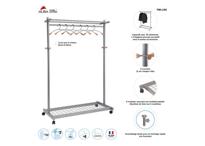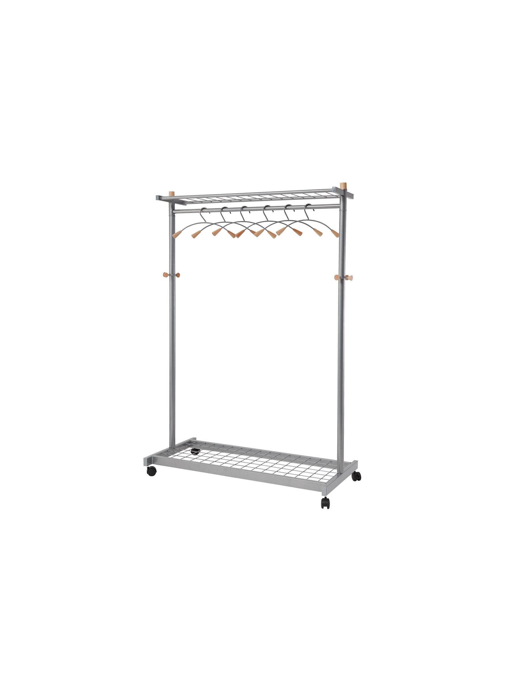 Dieser mobile Spind besteht aus 2 Regalen, 6 Holzhaken, 4 Rollen, einer Hängestange und 6 Metall- und Holzbügeln.