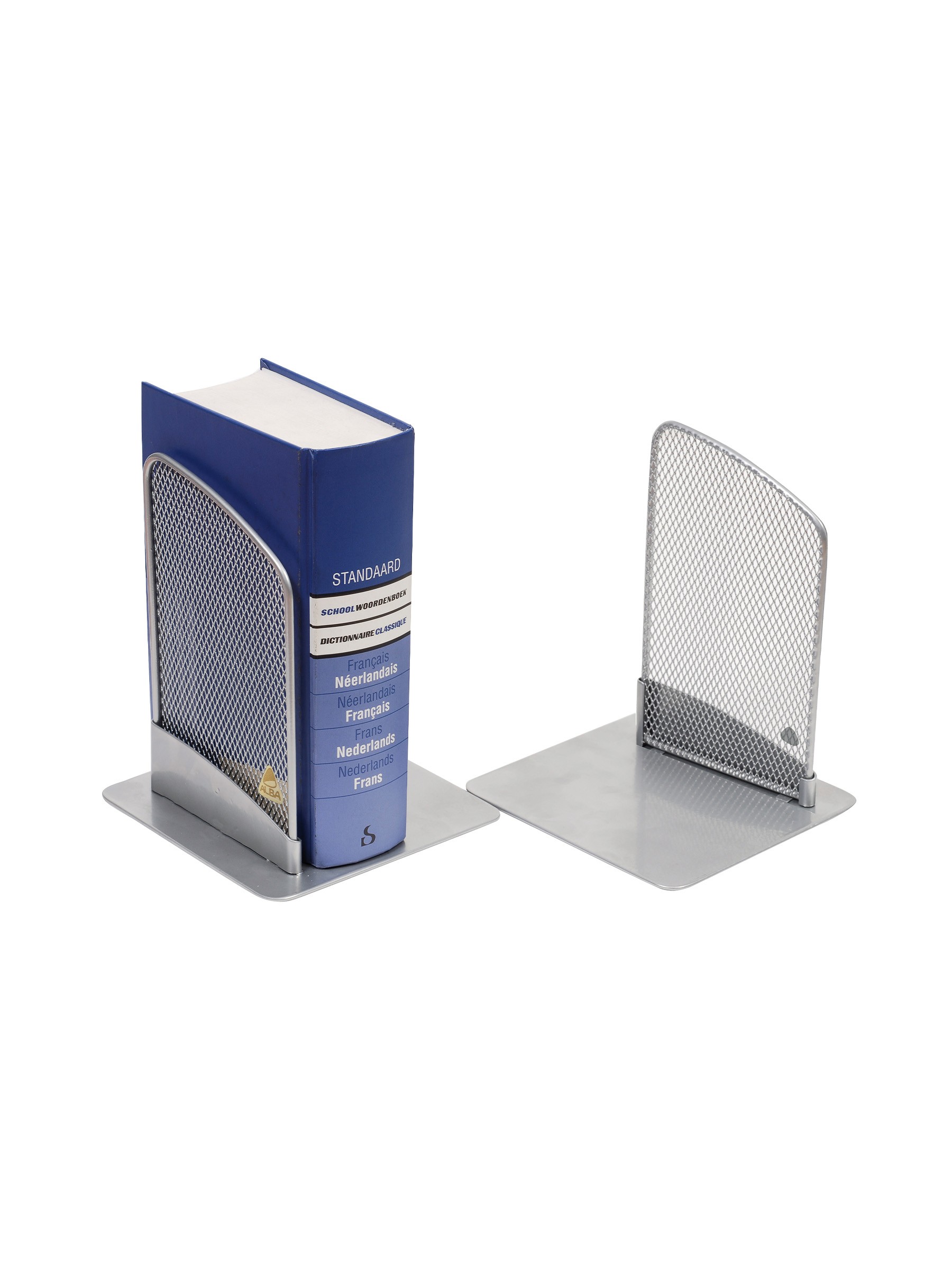 Diese Bücherstützen aus Mesh-Metall bestehen aus 2 Sockeln, die mit 4 Pads ausgestattet sind, und 2 Seiten, die die Bücher in Position halten.