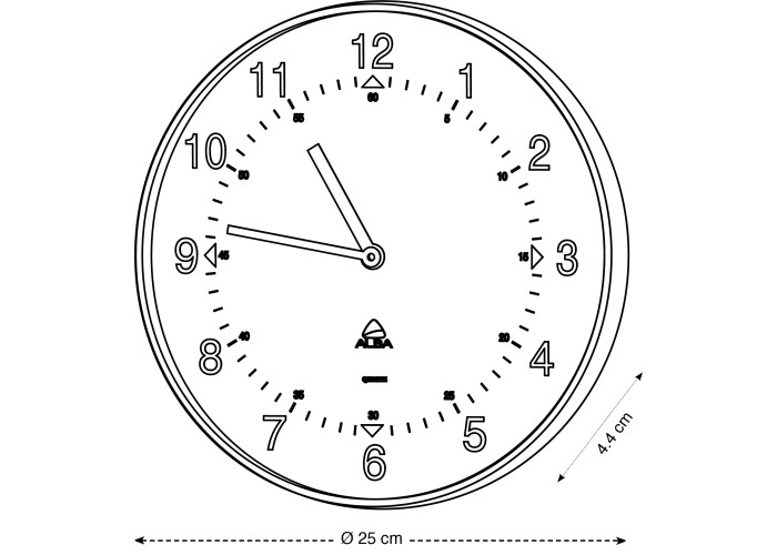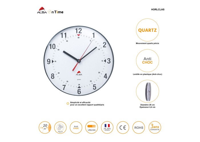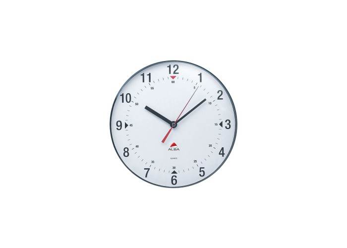 This wall clock comprises a plastic lens, large black figures on a white background, a high precision quartz mecanism and 3 hands including a red second hand. Simplicity to blend any office environment