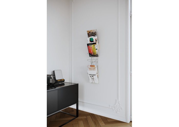 This wall-mounted wire literature display comprises 7 compartments for A4 documents.