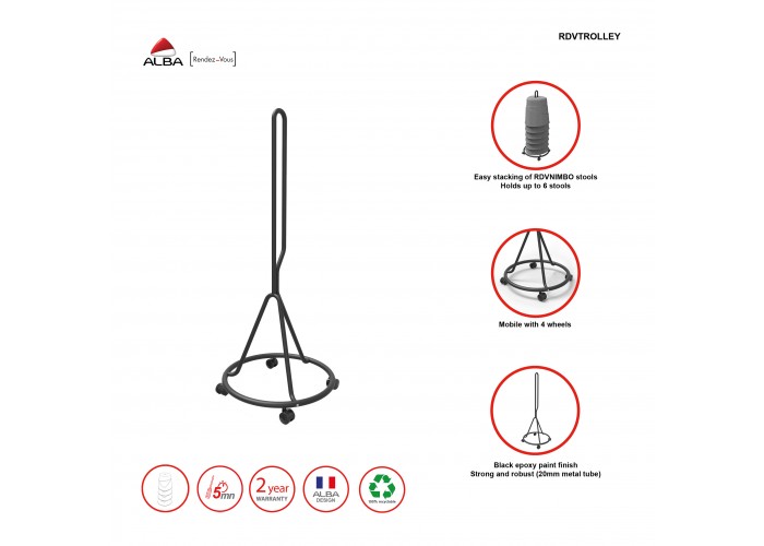 Simplifique el almacenamiento y el transporte de sus taburetes RDVNIMBO con este ingenioso y robusto carro. Capaz de apilar hasta 6 taburetes, garantiza un almacenamiento optimizado a la vez que ofrece una movilidad fluida gracias a sus 4 ruedas robustas y maniobrables.