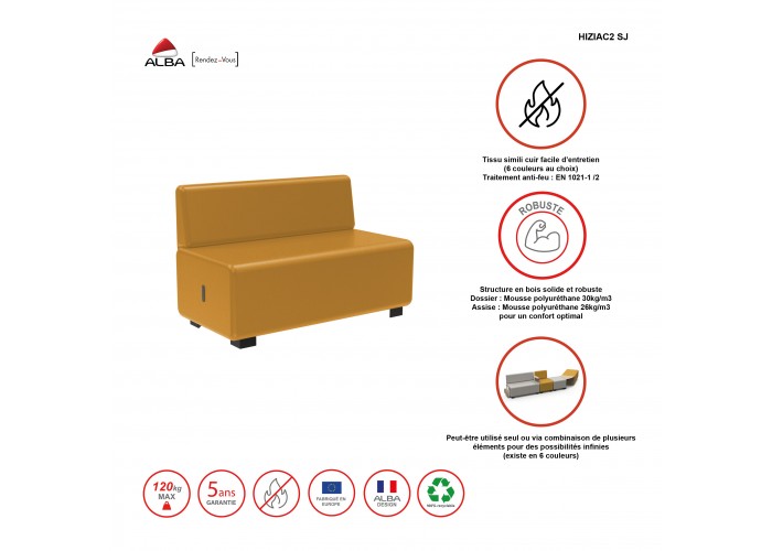 Dé a sus espacios profesionales un toque moderno y flexible con el sofá de dos plazas HIZIA. Multifuncional y elegante, se integra armoniosamente en una composición modular o puede utilizarse solo para satisfacer todas sus necesidades de mobiliario. Su tapicería de polipiel ignífuga y su cómodo asiento lo convierten en la opción ideal para zonas de recepción, salones u oficinas. Su diseño moderno aporta un toque de sofisticación a cualquier ambiente.