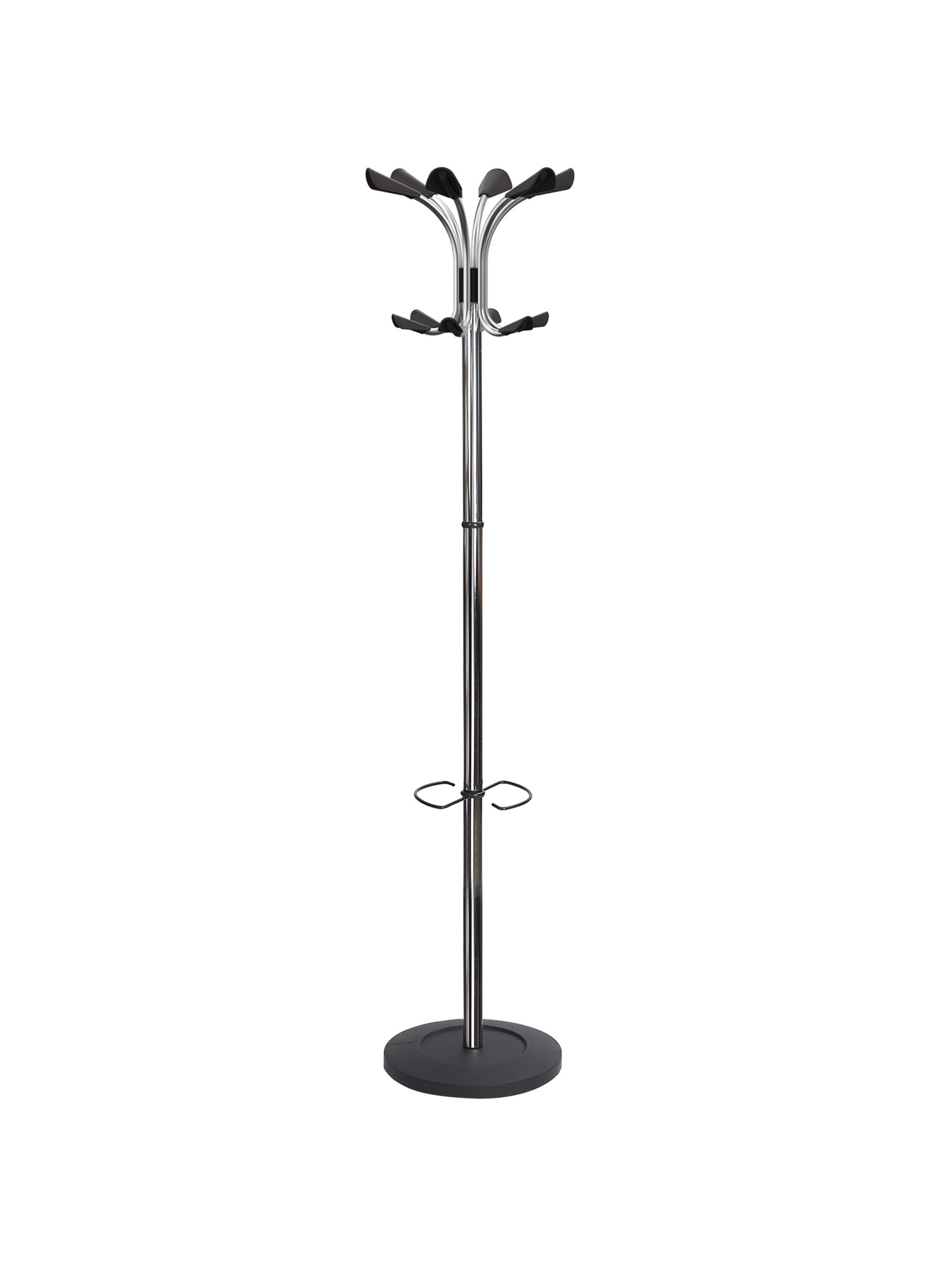 Proporciona un práctico almacenamiento para su ropa y accesorios, así como para colgar sus paraguas, todo en un mismo lugar. Este perchero de oficina consta de una cabeza formada por 6 patas dobles, un paragüero y una base metálica lastrada con un recipiente para el agua.