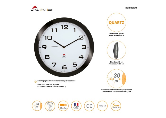 • Muy buena visibilidad de la hora hasta 25 m gracias a sus grandes dígitos negros de 1,8 cm