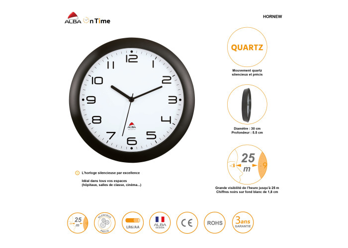 • Muy buena visibilidad de la hora hasta 25 m gracias a sus grandes dígitos negros de 1,8 cm