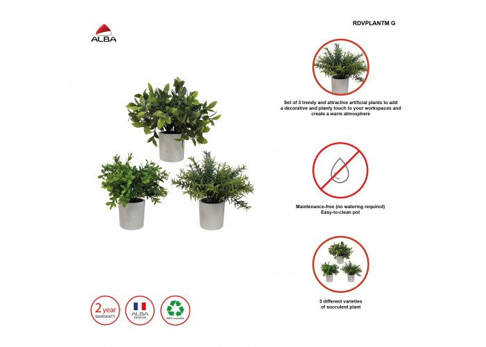 Aggiungete un tocco di freschezza ed eleganza ai vostri spazi con questa confezione di 3 piante artificiali di tendenza. Composto da piante di Eucalipto, Bosso e Rosmarino, questo trio decorativo crea un'atmosfera calda e naturale senza alcuna manutenzione. Grazie ai vasi di carta ecologica e al design compatto (20 cm di altezza), queste piante sono perfette per ravvivare uffici, banconi, sale pausa o mense. Una scelta estetica e pratica per rinverdire i vostri spazi con stile.